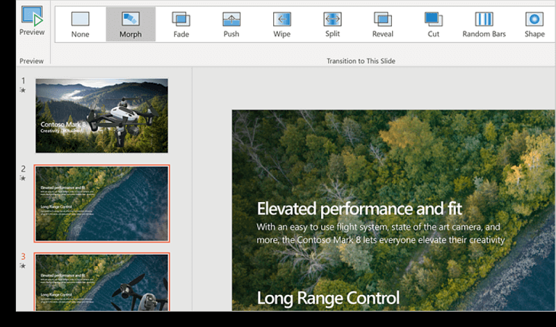 - Animacje: przejścia między slajdami oraz animacje elementów na slajdach